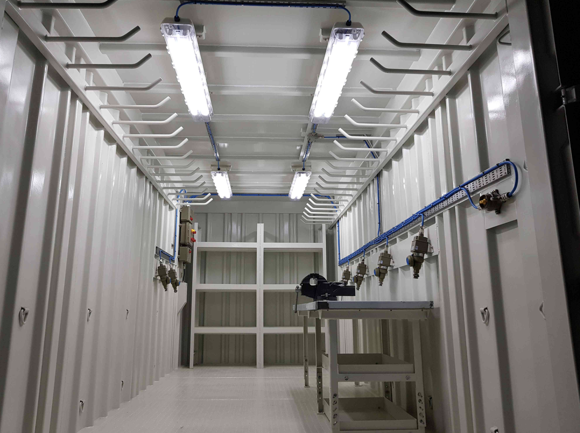 Mobile workshops, storage spaces, and control rooms equipt for offshore operations. Includes lighting, power, shelving, and HVAC.